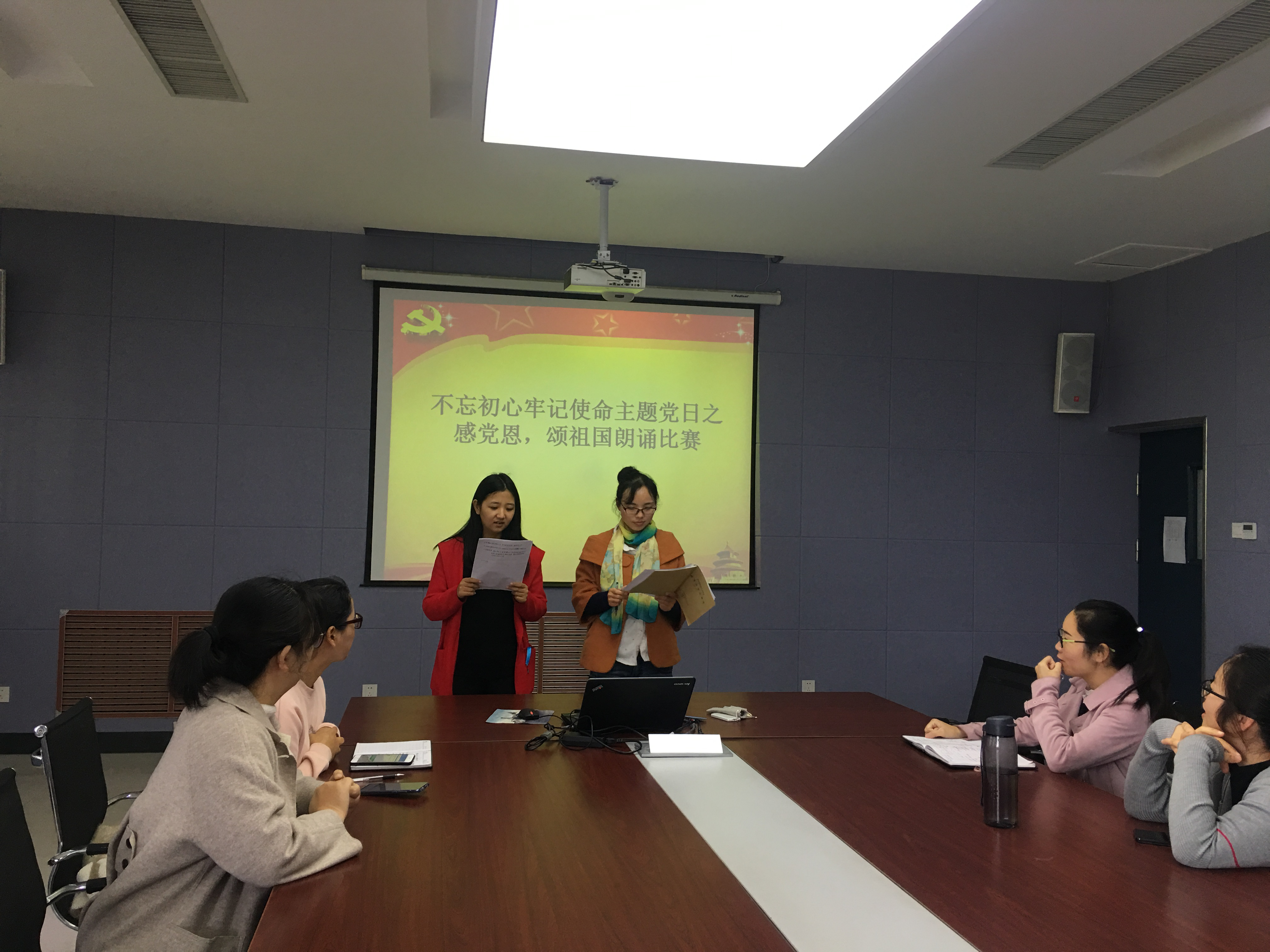 此次主题党日活动分为两个环节,第一个环节是“感党恩,颂祖国”诗歌朗诵比赛,第二个环节是“学楷模,找差距”——新乡英雄楷模史来贺事迹学习活动。根据活动安排,药学院党支部于21日上午在基础楼411会议室进行了“感党恩,颂祖国”诗歌朗诵比赛,全体无课党员及群众代表参加了此次活动。在一阵气势磅礴的音乐声中,药学院党总支第一支部进行《祖国啊,母亲》的诗歌朗诵,表达了对祖国深深的热爱之情,贾闪闪老师和娄晓月老师朗读了《祖国啊,我亲爱的祖国》,随后与会老师们朗诵了《我爱这片土地》。活动中老师们以饱满热情倾诉了对党的感恩之情,对祖国的热爱之情,展现出积极向上,锐意进取的精神风貌,及拳拳诚挚的爱国情怀。