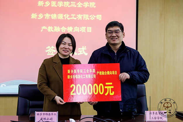 锦源化工常务副总经理陈冬梅和三全学院副院长邱永建代表双方签署横向项目合作协议,与会人员见证项目签约。据悉,该合作项目由企业提供二十万横向经费,用于阿奇沙坦酯原料药及关键中间体的研究和开发。随后,双方领导和老师围绕人才培养、科研合作和社会服务等方面开展深入交流探讨,为双方在更深更广领域的深入合作奠定了良好基础。