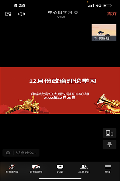 12月26日,药学院党总支理论学习中心组在腾讯会议进行线上12月份政治理论学习,药学院院长李长正、药学院党总支书记李印省、药学院副院长马矜烁及中心组其他成员参与学习,会议由李印省主持。