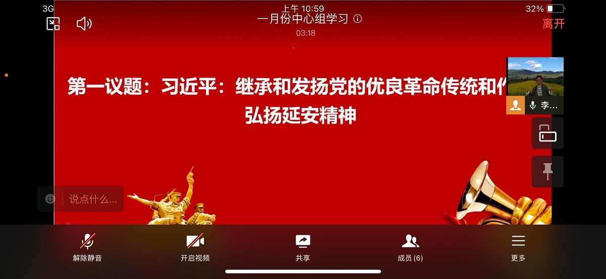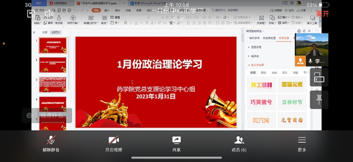 1月31日,药学院党总支理论学习中心组在企业微信进行线上1月份政治理论学习,药学院院长李长正、药学院党总支书记李印省及中心组其他成员参与学习,会议由李印省主持。