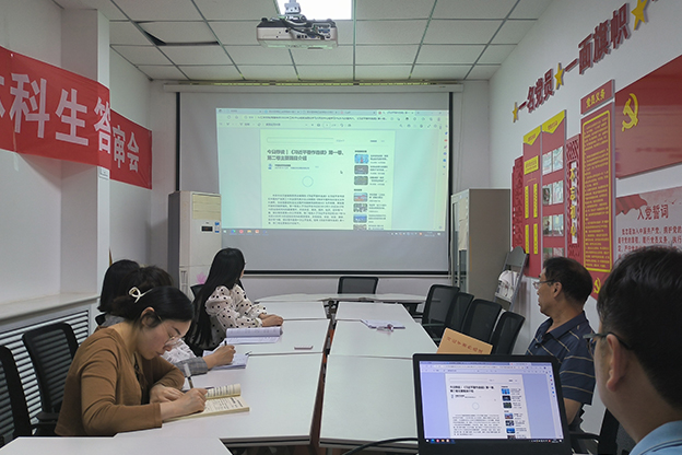 5月23日,药学院党总支理论学习中心组在会议室进行5月份政治理论学习,药学院院长李长正、药学院党总支书记李印省及中心组其他成员参与学习,会议由李印省主持。