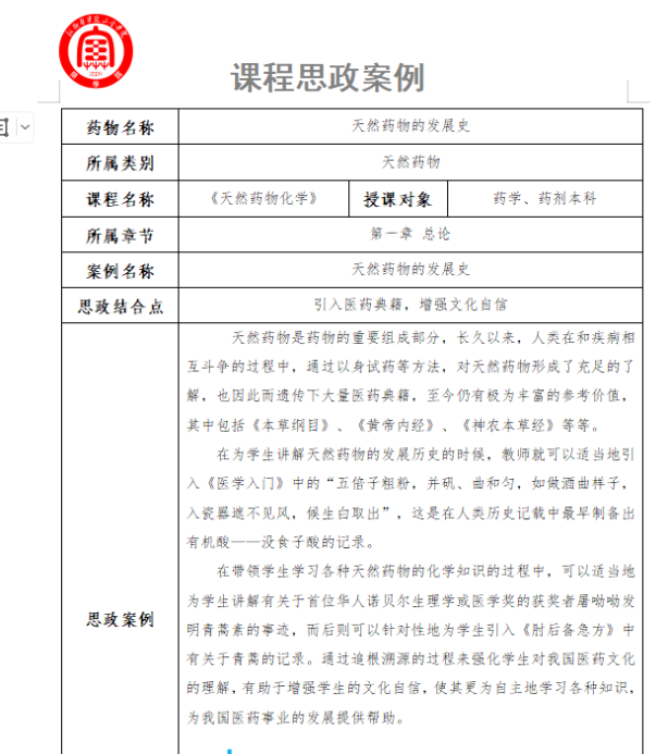 《天然药物化学》是一门研究天然药物中化学成分的学科,对于开发新药、保障人类健康具有重要意义。在当前高等教育中,课程思政建设是落实立德树人根本任务的重要举措。将思政教育融入天然药物化学课程中,有助于培养学生的专业素养、创新精神和社会责任感。