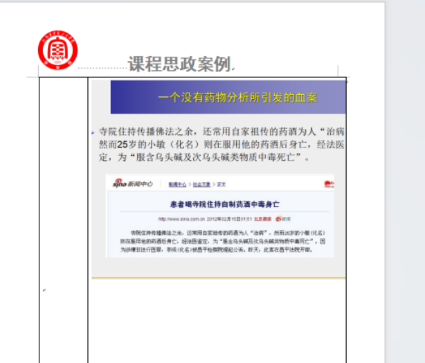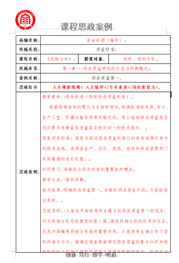 药物化学与分析教研室有《药物分析》《药物化学》等药学相关课程,已全部开展课程思政,目前开展的方式主要以日常课程中融入课程思政为主,每门课中合适知识点加入课程思政元素,主要有职业道德,执业标准,行业要求,文化自信,制度自信等方面。目前课程思政案例库内有药物分析相关课程思政案例15例,药物化学相关课程思政案例10余例,在日常授课中常态化进行。