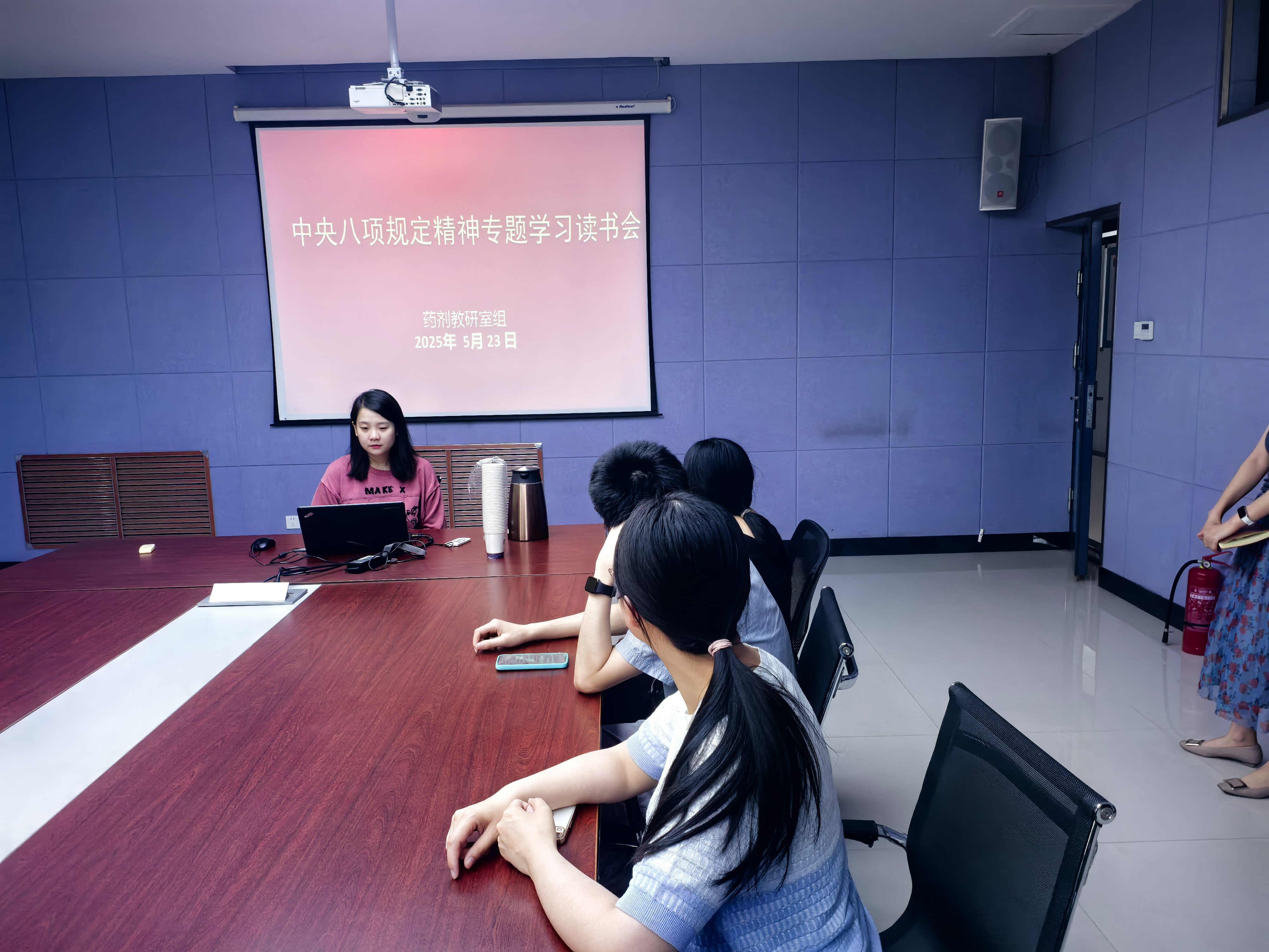 2025年5月23日,药学院党总支药剂教研室组进行了中央八项规定专题学习,学习以小组形式进行,药剂教研室组学习人为魏婧、侯盼盼、杨金昌、杨春杰。