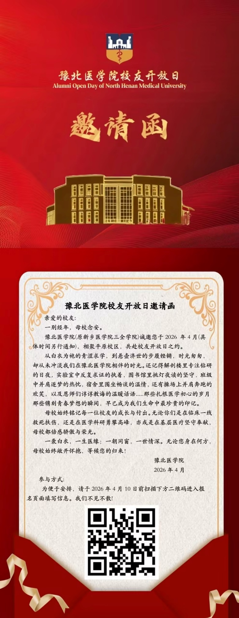 豫北医学院(原新乡医学院三全学院)诚邀您于20264月(具体时间另行通知),相聚平原校区,共赴校友开放日之约。